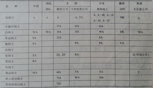 表1-1-2 國內外剛玉磨料品種代號對照表