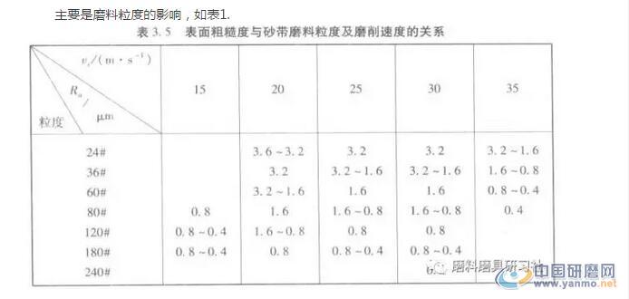 隨砂帶速度的提高,單位時間內進入磨削區的磨粒數增多,單顆磨粒切削深度變小,金屬表面變形小,同時又縮短工件與磨粒的接觸時間,減少了金屬因磨粒耕犁形成的隆起高度以及熱塑性變形,因而粗糙度值隨之減少。
